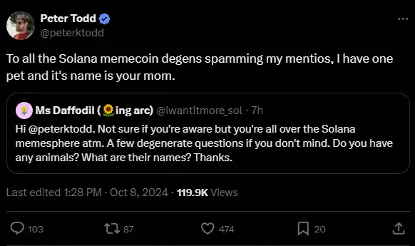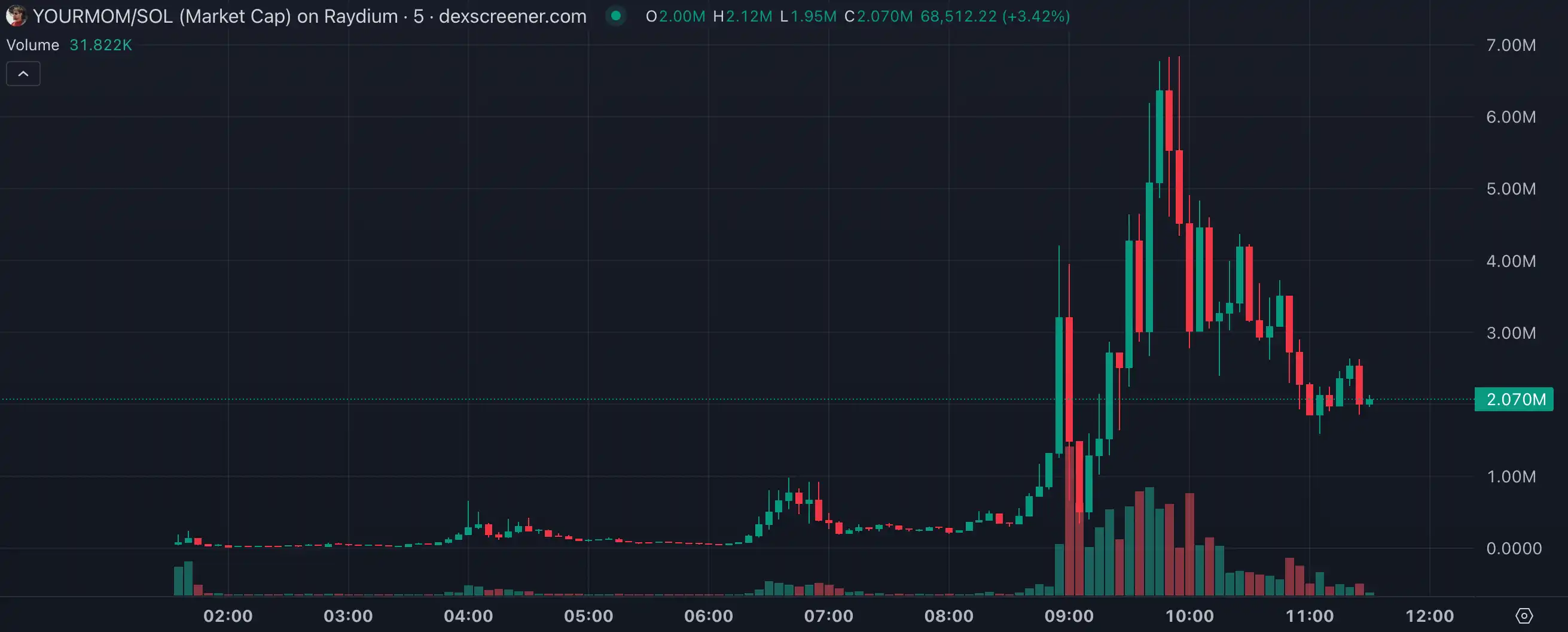 todd 被怀疑是中本聪后,大量网友邮件其询问他是否有什么宠物,大量垃圾邮件使其恼怒,故在推特回应「我只有一只宠物,就是 your mom」对网友进行回击,随后链上便出现了$yourmom 类相关 meme。其中,SOL 版本的 YOURMOM 被视为本轮炒作中「唯一的金狗」。