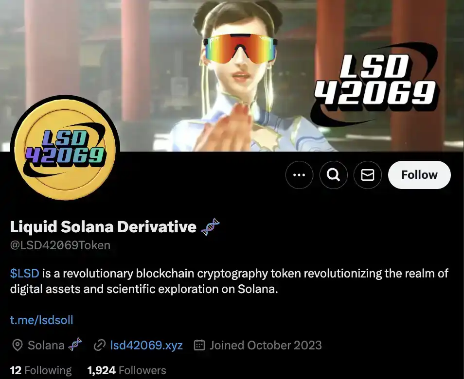 LSD 是去年底 Solana meme 热潮中的老币之一,也是一个主打少女风抽象概念的 meme,被社区视为「Solana 版的 SPX6900」。