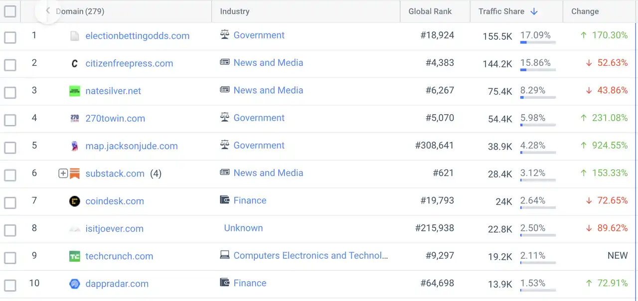 · 排名第一的 electionbettingodds.com 是一个知名的选举预测市场聚合器,聚合了包括 Polymarket 在内的 5 个预测市场的数据