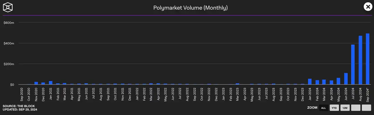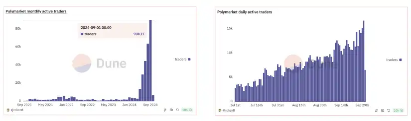 Polymarket 在 9 月创下了 9 万的月活新高,日活基本保持在 1 万以上。然而 Polymarket 网站的访问量在 9 月达到了 1500 万,访问量/月活比值超过了 166。