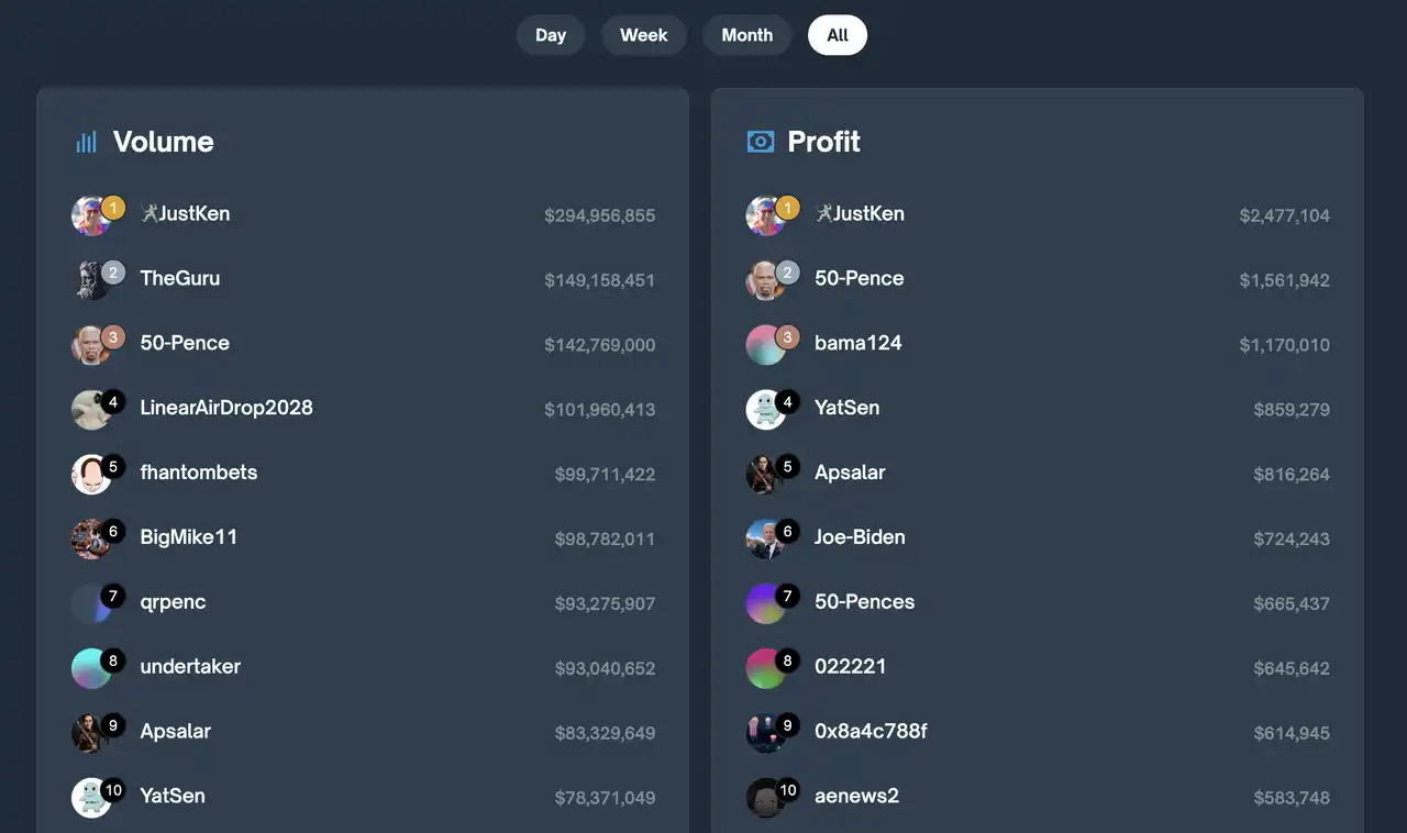 Polymarket 的排行榜数据佐证了这一点。目前总盈利超过 100 万美元的用户仅有 3 位,而 pump.fun 上总盈利超过 100 万美元的地址有 197 个。考虑到 Polymarket 的 9 月月活为 pump.fun 的 14%,且成立于 2020 年,靠 Polymarket 致富的概率似乎更小。