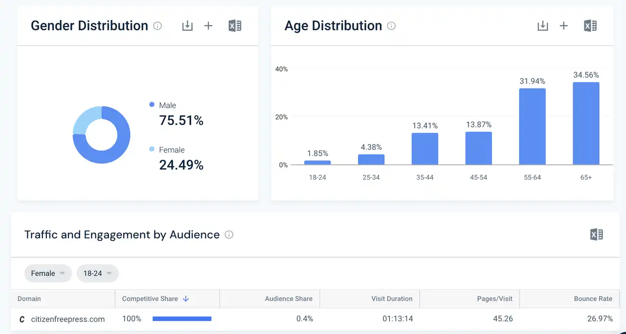 · citizenfreepress.com 是一个偏向保守派的美国政治新闻聚合网站,其中一半用户是超过 55 岁的美国男性