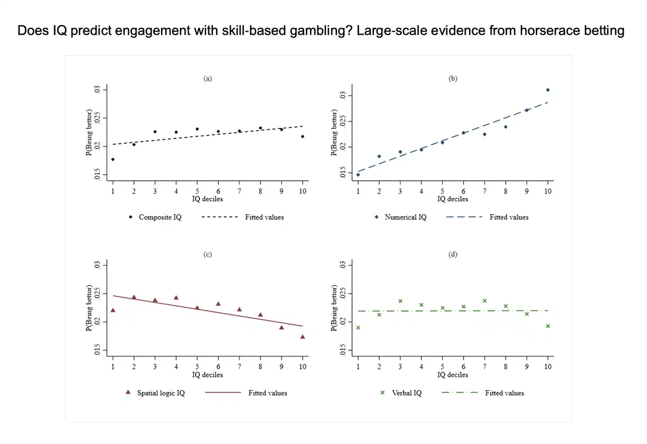 一篇发表于 2022 年、面向超过 4 万芬兰居民在线赛马投注行为的研究显示,拥有更高数值 IQ (即在算数推理、数学问题解决和定量分析测量中表现更好) 的人会对基于技能的赌博 (与之相对的是基于运气的赌博) 呈现出明显更高的参与意愿。该研究还显示,在总下注人群中,约 9% 的玩家收益大于损失。在 Polymarket 中,这一比例为 11.5%。