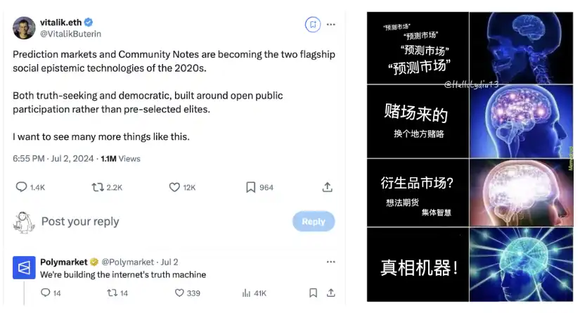 Vitalik Buterin 可能是 Web3 世界最有影响力的预测市场倡导者。早在 2014 年,他便将预测市场当作 Futarchy (Robin Hanson 设想的一种以投注治国的未来政府形式) 的一种实践进行了讨论;在 2020 年的一篇探索「可信中立」机制的文章中,他再次将预测市场作为案例,随后还提出了一种将极不可能事件绑定下注的预测市场设计;2021 年,他发文系统论述了预测市场的价值支撑以及去中心化的优势;本周期以来,他更是频繁公开表示对预测市场的看好,并参投了 Polymarket 在今年 5 月的 B 轮融资。