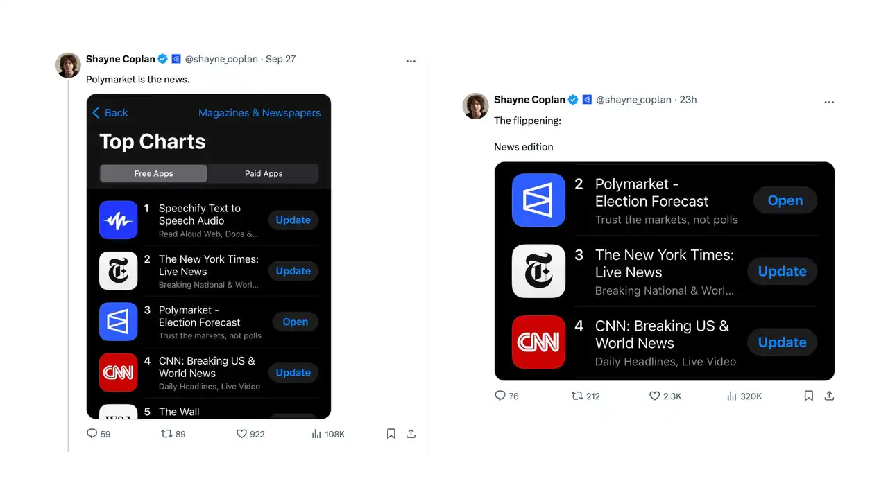 事实上,Polymarket 的创始人 Coplan 在 X 上一直使用包括 「替代新闻源」(Alternative news source),「未来媒体」(The future of media) 等词汇描述自己的产品,并且多次引用 Polymarket 在 App Store 新闻板块下的排名。数据显示,Polymarket 虽然网站访问量只有纽约时报的 3%,但在页面停留时长、跳出率等指标上的表现都较为优秀。