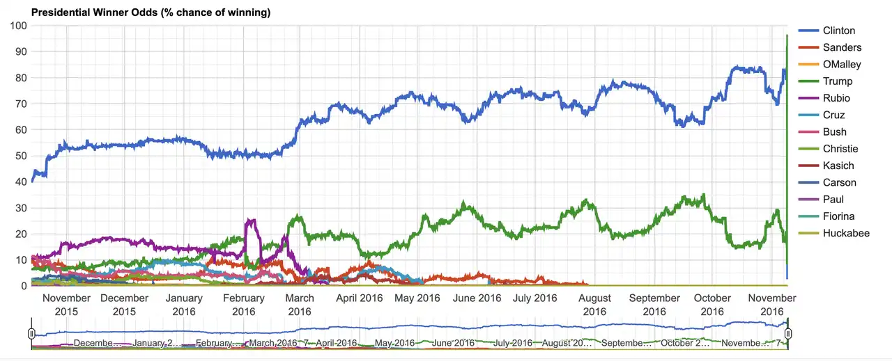 2016 年大选的投注赔率,希拉里始终保持绝对领先