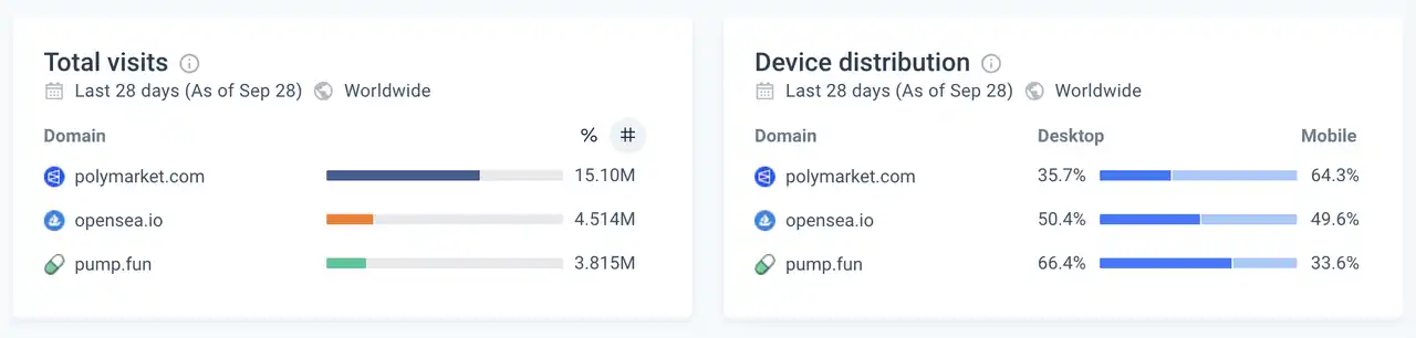 Polymarket, Opensea, pump.fun 的网站数据对比 来源: similarweb