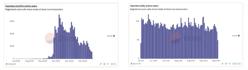 与之相比,Opensea 在 9 月月活为 11 万,日活在 9 千左右,与 Polymarket 接近。Opensea 在 9 月的网站访问量为 450 万,访问量/月活比值约为 41。