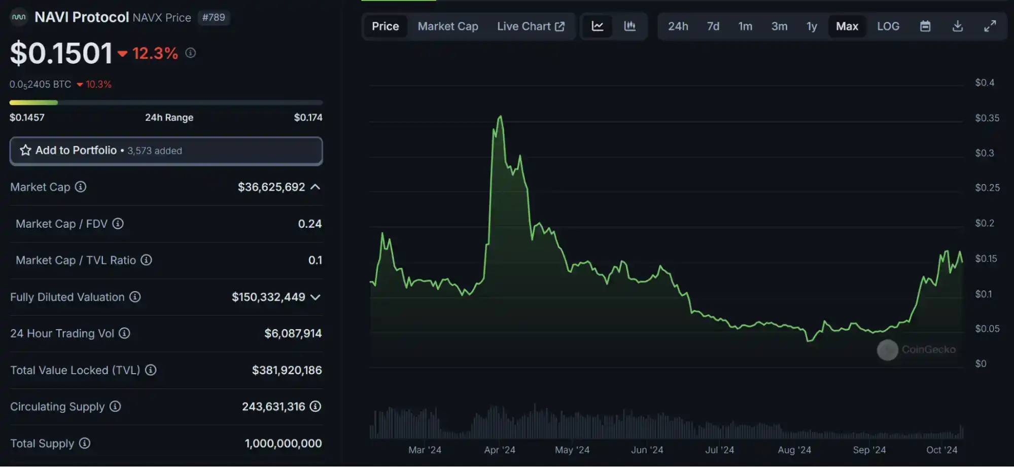 但代币价格表现却不如产品亮眼,在 SUI 大涨的这段期间,代币 NAVI 在 30 天随之上涨超过 150%,但距离历史新高仍有超过 100% 涨幅,相较 SUI、Cetus 挑战前高的情形不同。