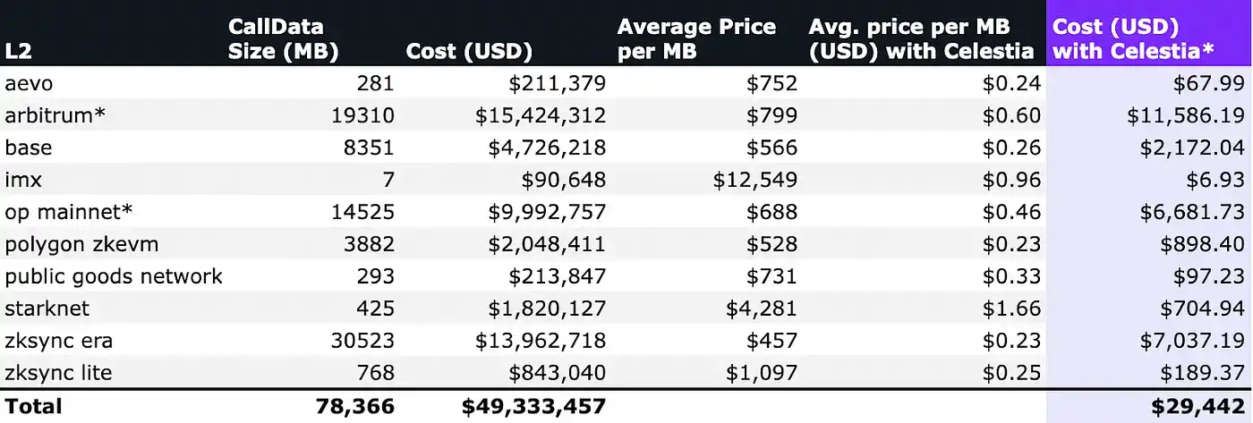 从下图可以直观的看出,各个项目采用 Celestia 后,平均成本可以缩减至原来的 80%-90% 左右。