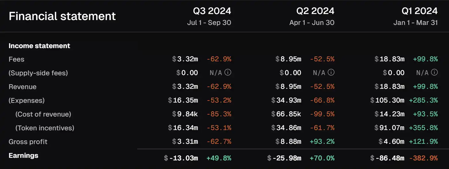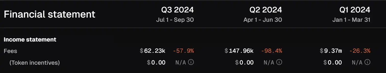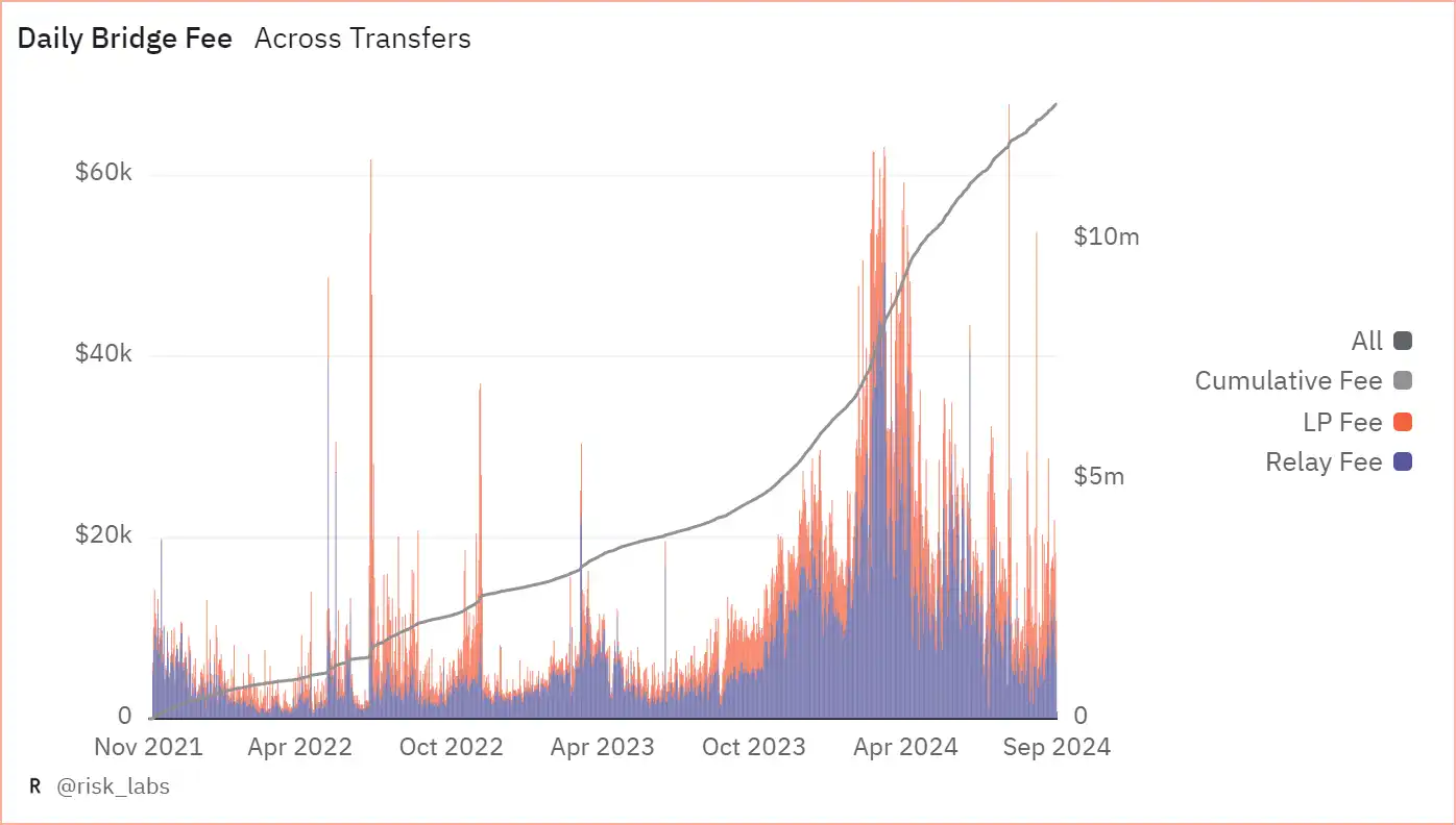 在跨链交易量方面,Across 的跨链数量在年初 Q1 达到在 24 亿美元的较高水平。随后 Q2 的 MEME 热将跨链交易量维持在 25 亿美元 之上。然而与之相背离的是链上转账虽然增多,但是手续费并没有提升到其应有的水平。反而是在今年 Q1 达到了顶峰,随后在 Q2 下跌 33%,Q3 腰斩 66%。Q2 下降的原因在于坎昆升级使 L2 的跨链 GAS 下降了很多。Q3 则是由于市场不景气导致的交易量下滑。