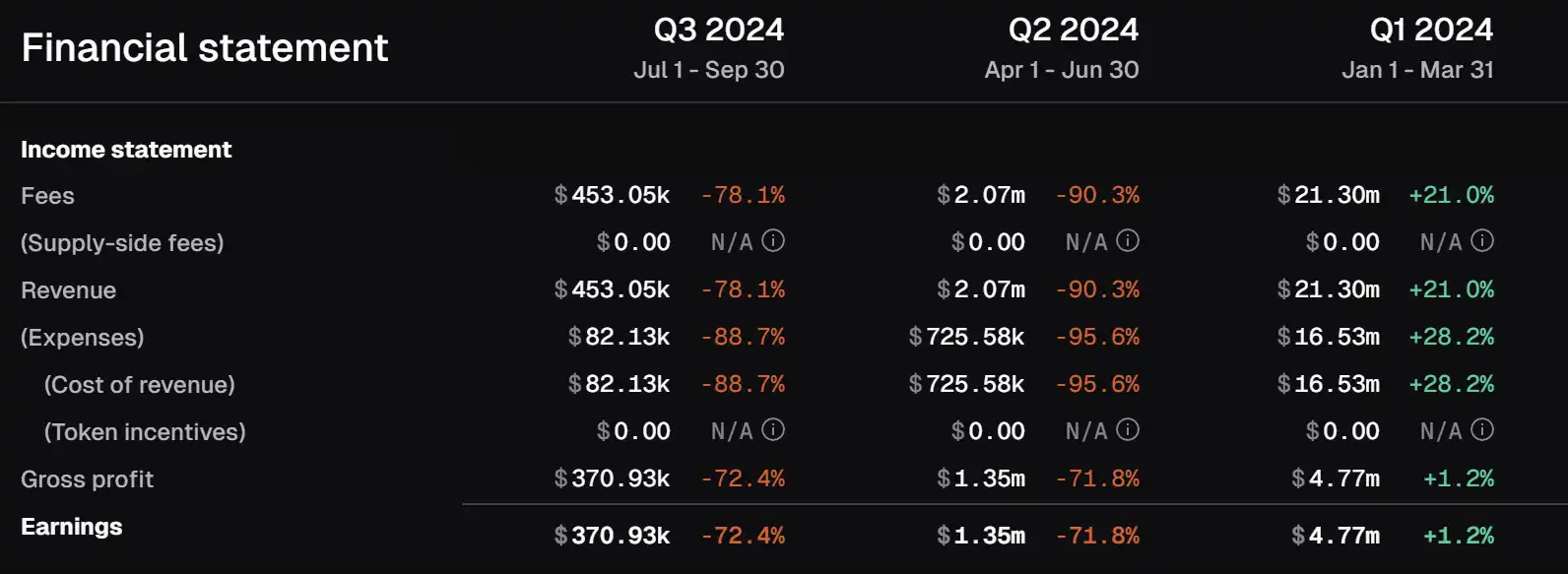 具体来说,Arbitrum 的营收在 Q1 后经历了暴跌。与 Q1 2738 万美元 相比,其 Q2 737 万美元 和 Q3 334 万美元 的数据显得不堪入目,一部分原因是由于 Q2 期间市场环境的不景气,另一部分原因来自于其他 L2 的流量争夺。