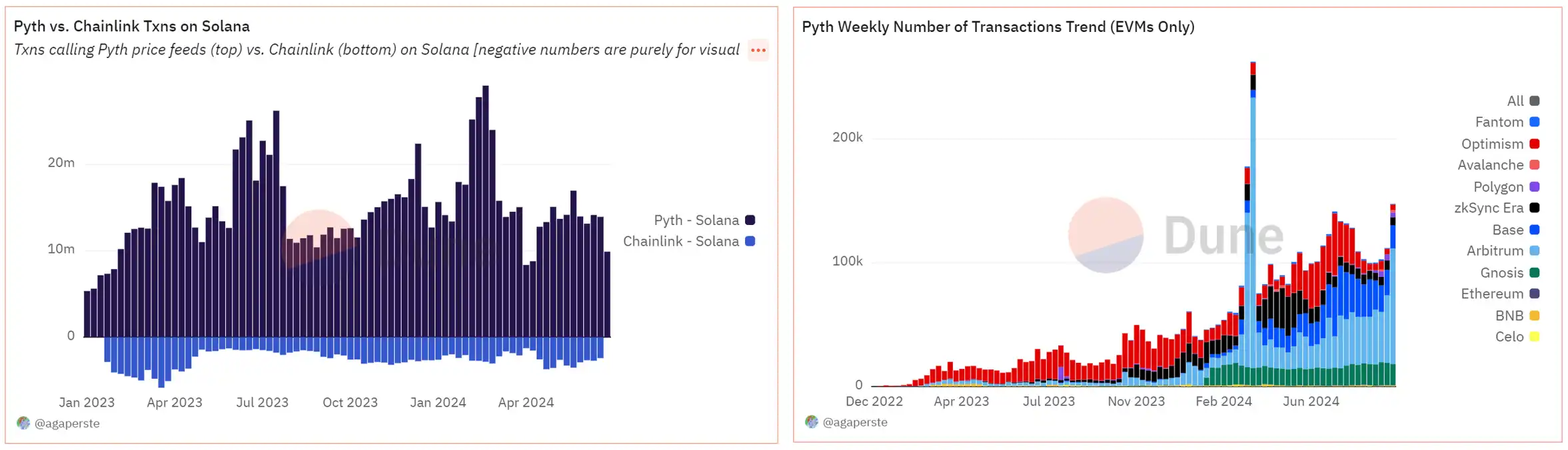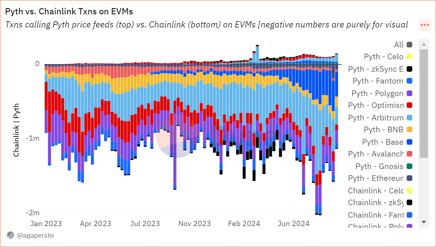 Pyth 和 Chainlink EVM 链处理交易笔数对比,数据来源:Dune