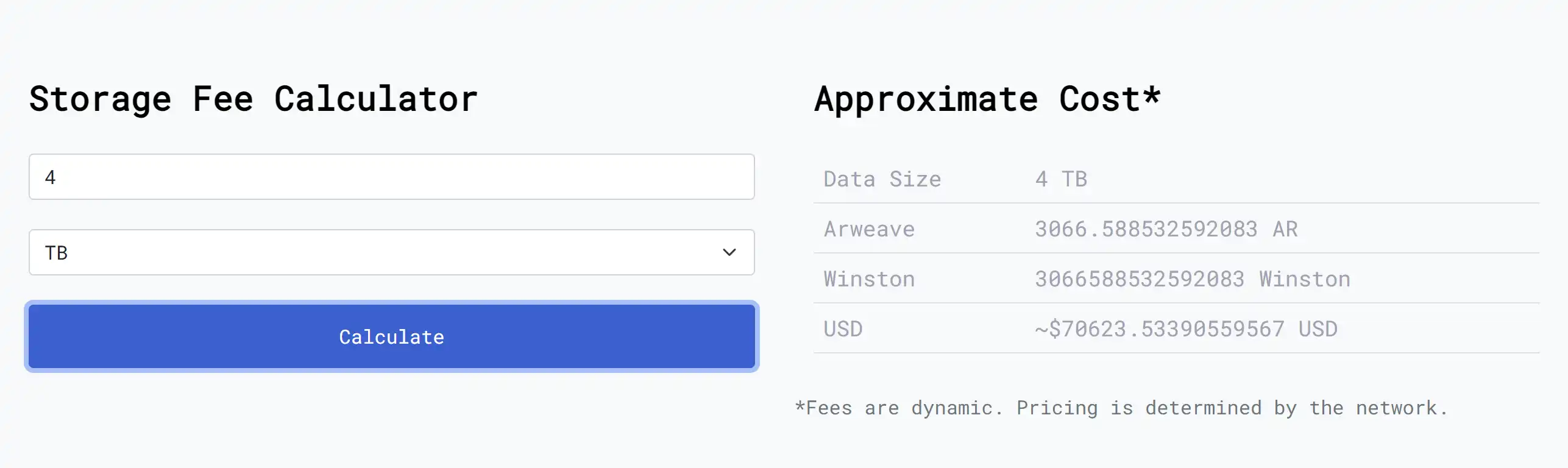 Arweave 存储费用计算,数据来源: https://ar-fees.arweave.dev/