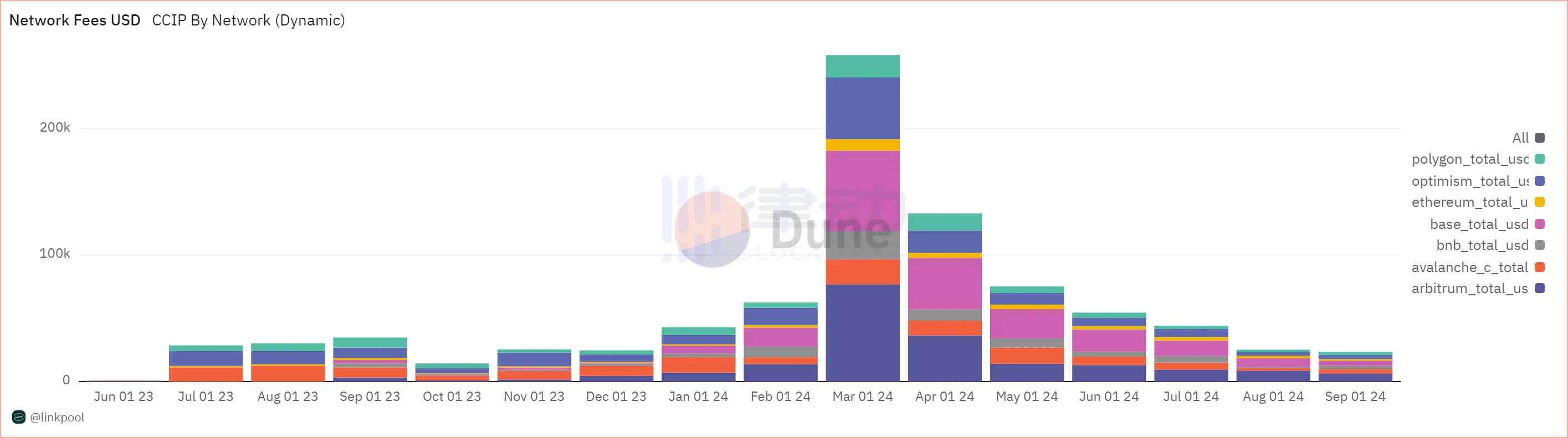 根据 Dune 数据显示,CCIP 以 Cross-chain fee 作为主要的业务收入来源,并主要由 Arbitrum、Base、Optimism 等主流 L2 贡献。跨链收入很大程度上取决于市场的景气程度,对市场反应较为敏感。在今年 3 月,BTC ETF 通过后的利好催化下其跨链收入达到顶峰,约为 25.8 万美元。待链上行情遇冷后,Q2 收入减少 30%,并在 Q3 市场达到极度冰点,收入再度下跌 70% 并最终维持在的 2.5 万美元每月。