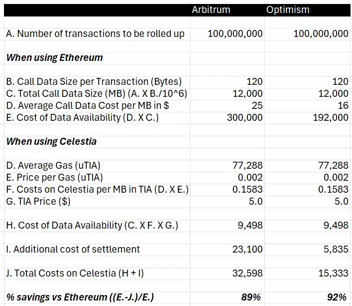 Celestia 的用户画像主要集中在 Rollup 中。市场上的 L2s 使用以太坊进行数据可用性和交易的结算会导致高昂的成本,而采用 Celestia 后会使成本产生「质」的变化。以 Arbitrum 和 Optimism 为例,如果选择 Celestia 而非以太坊,那么每 1 亿笔交易将分别会引致$32,598 和 $15,333 的 DA 成本,使总成本分别降低 89% 和 92%。