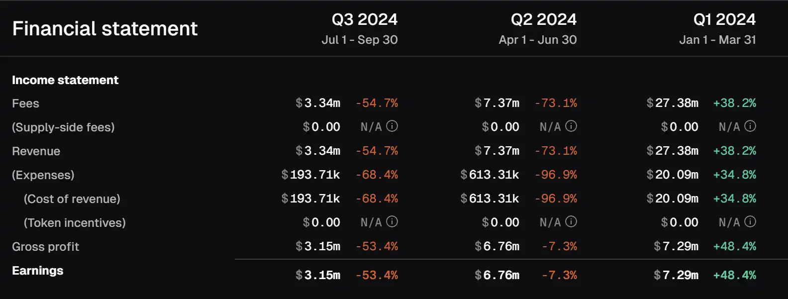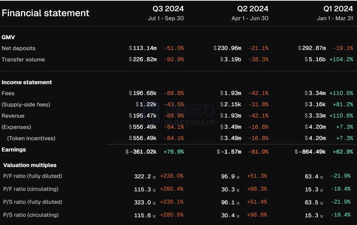 Across 各项财务指标变动情况,数据来源:TokenTerminal
