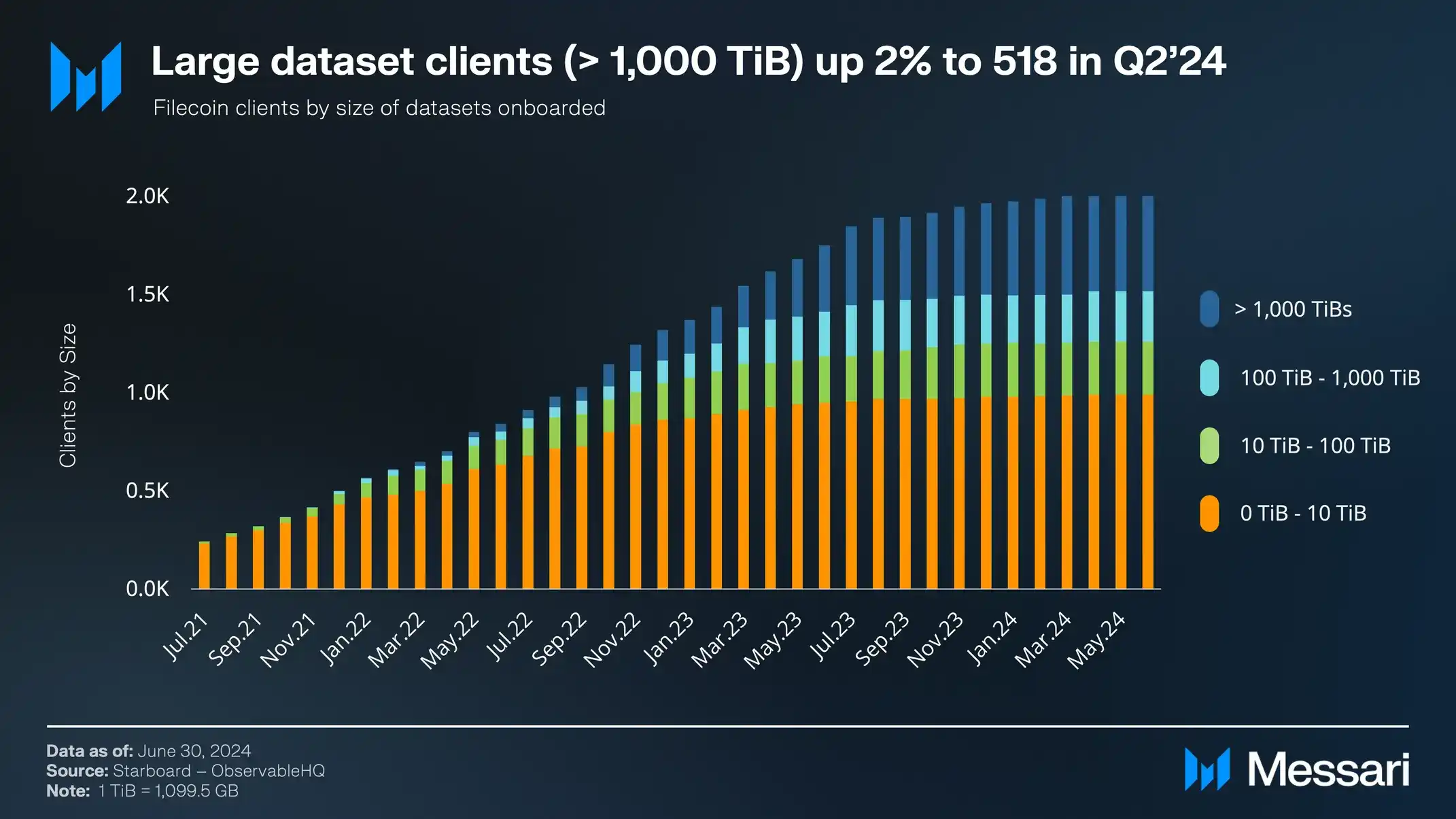 Filecoin 大于 1,000TiBs 存储用户变动情况,数据来源:Messari