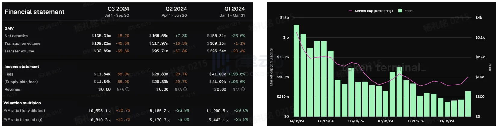 自 2024Q1 到 2024Q3,无论是从交易量还是跨链费用来看,以美元计价下 Axelar 的各项指标不容乐观,同比锐减 50% 以上,均呈现出加速递减的趋势。以市盈率角度审视,Axelar 第三季度的 P/F ratio 不减反增。主要原因是其市值下滑约 30%,相较于跨链费用的收入腰斩而言下降程度较低,因此 P/F ratio 整体虚高。