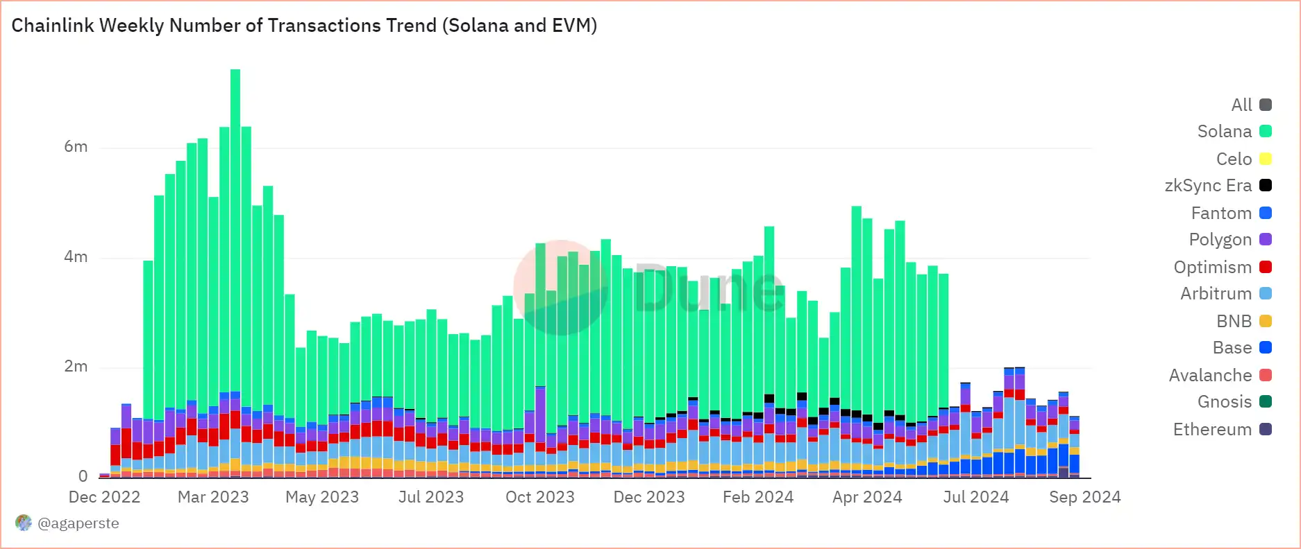 值得注意的是,根据 Dune 的数据显示,对于整个 Crypto 市场而言 Chainlink 处理交易笔数最多的来自 Solana,来自 EVM 的交易笔数约占 Solana 的一半。