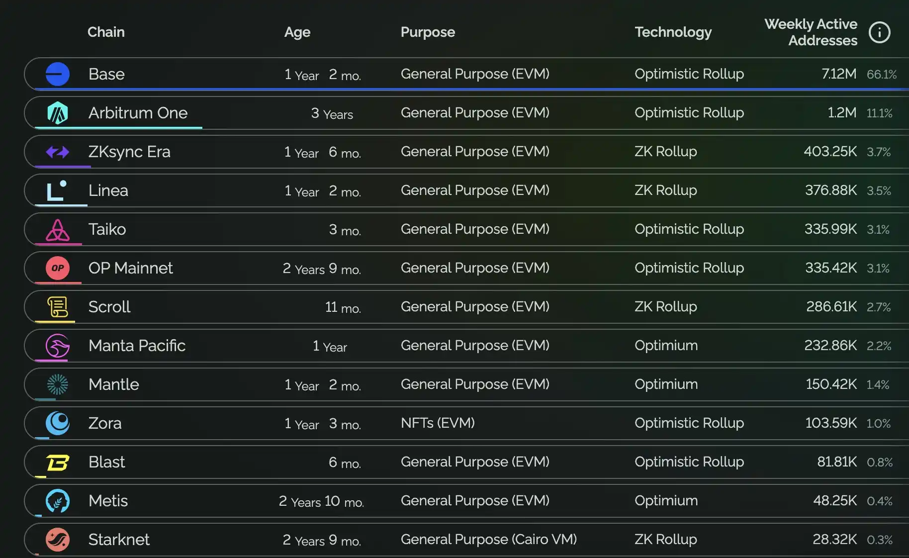 L2 周地址活跃度排名,数据来源:L2BEAT