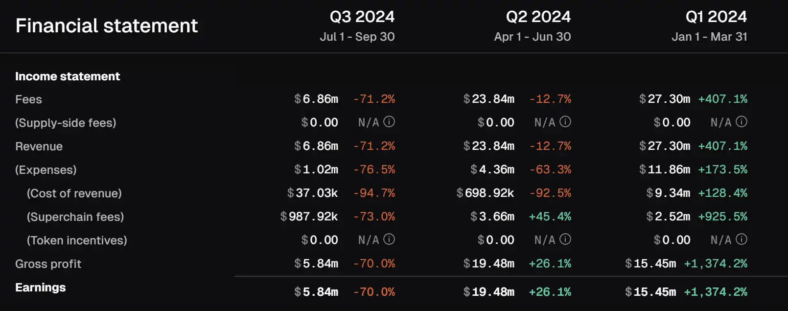 一套组合拳下来,Base 实现了后发制人,完成了对 Arbtrum、Optimism 的赶超。其 Q1 营收达到 27M 与 Arbitrum 持平,尽管经历了 Q3 收入减少 70% 的打击,净利润也依然高达 584 万美元。