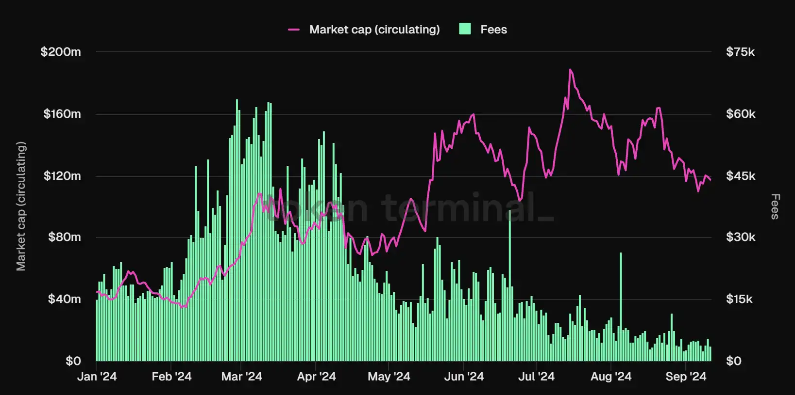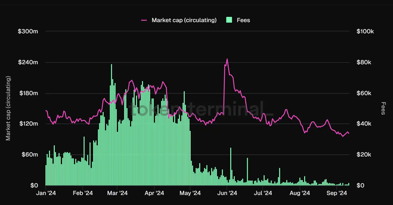 Stargate 交易费用和流通市值对比图,数据来源:Tokenterminal