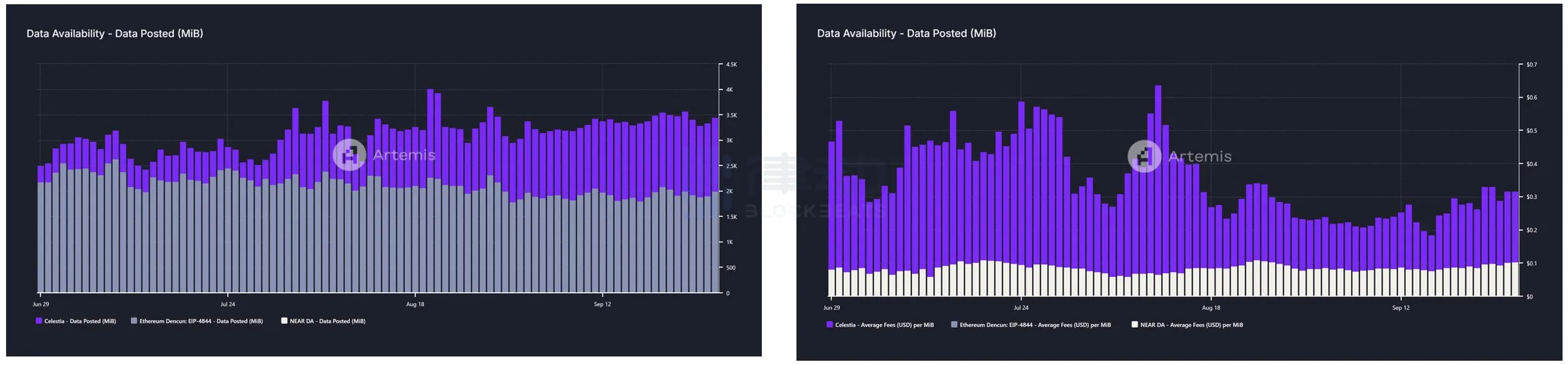 左图:Celestia/Ethereum Data Post 情况;右图:Celestia/Ethereum 每 MiB 的平均费用,数据来源:Artemis
