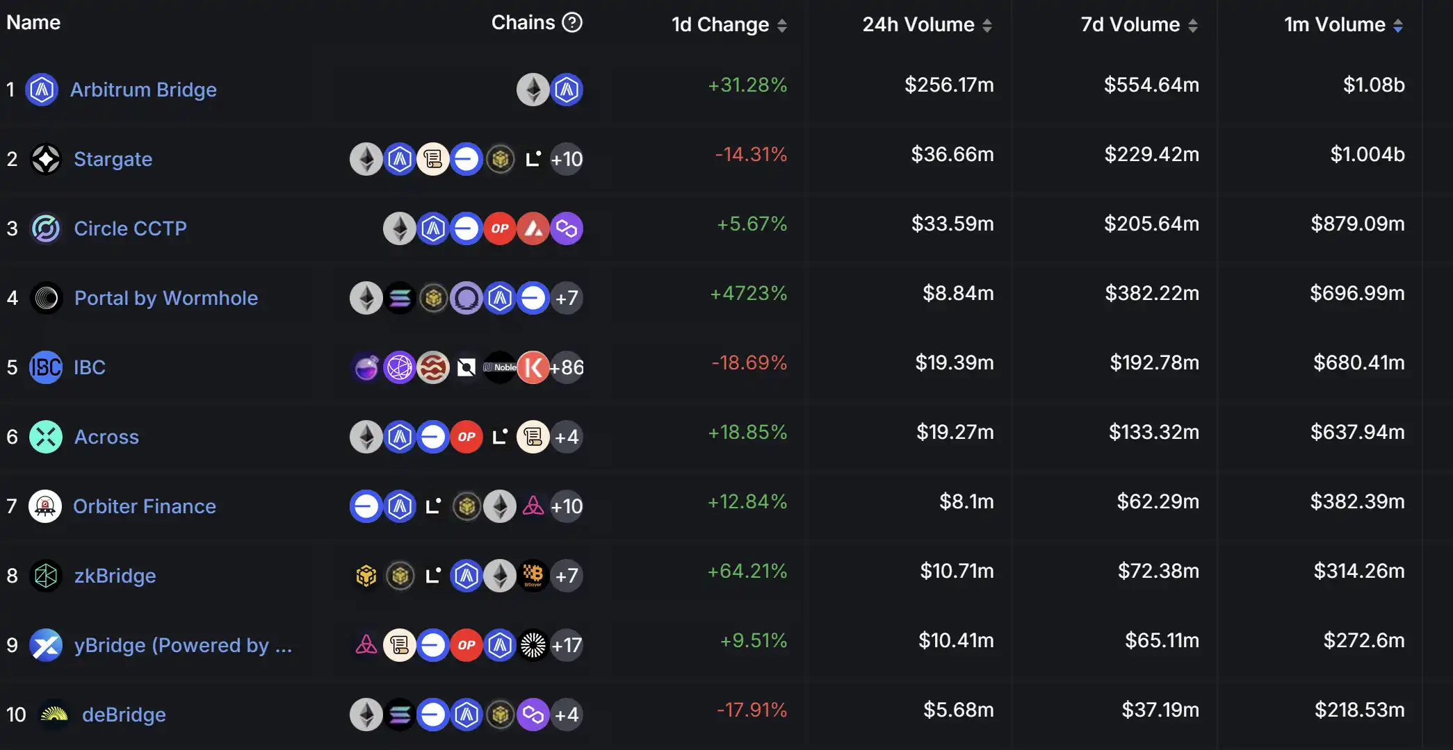 Stargate 是由 LayerZero 官方推出,基于 LayerZero 技术开发的可组合流动性传输协议。Stargate 的定位更加聚焦于成为全链 DeFi 的跨链应用,目前已涵盖包括 Abriturm、Scroll、Base、Linea 等 10 余条公链,根据 DeFiLlama 数据在近一个月中其规模仅次于 Arbitrum Bridge 达到$1b,稳居第二。