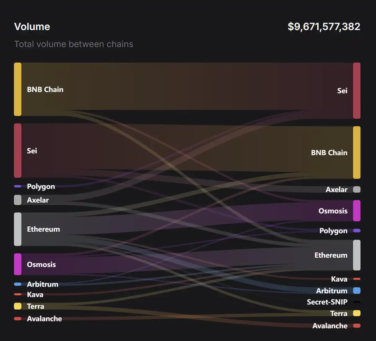 Axelar 的商业模式依然沿用传统的「收租」方式。在 Axelar 网络上进行的交易和智能合约执行会产生相应的费用,这些费用以 AXL 代币支付并为网络带来直接收入。用户进行跨链交易会向 Axelar 网络支付 GAS,随后 Axelar 网络将其重新分配给质押者。Axelar 的主要支出在于支付给验证者的$AXL 代币奖励。同时,Axelar 也在开发 AVM,意图打通跨链层面的智能合约开发。根据官方数据显示,目前最主要的跨链交易来自于 BNB Chain 和 Sei。二者的交易规模为 34 亿美元,约占总交易量 40%。
