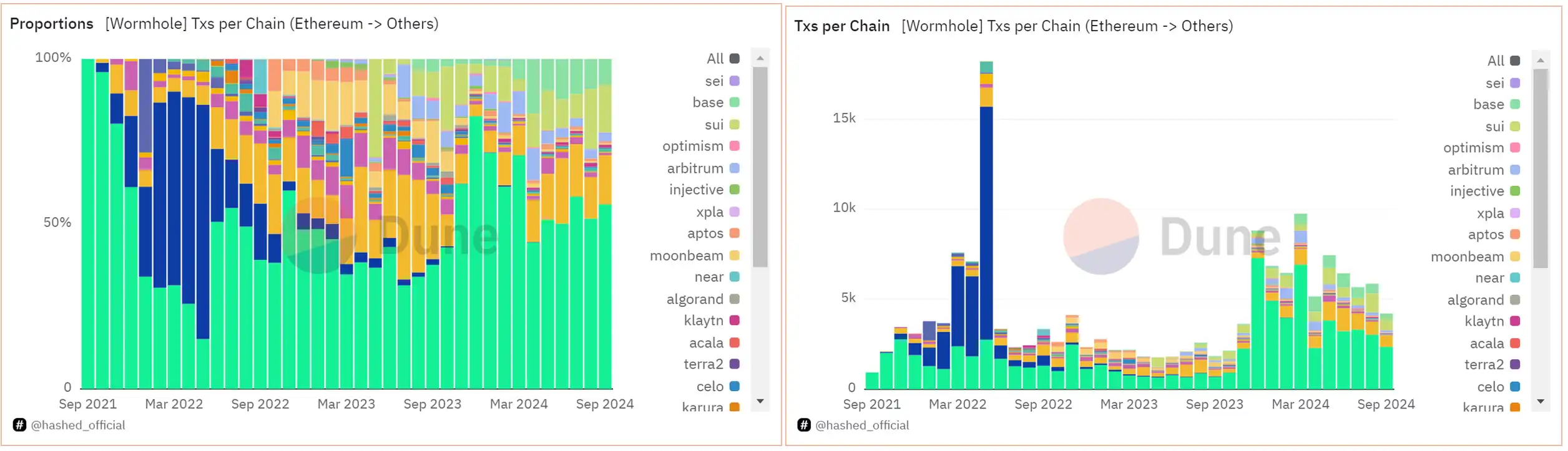 Wormhole 跨链来源和交易笔数(从 Ethereum 到其他链),数据来源:Dune