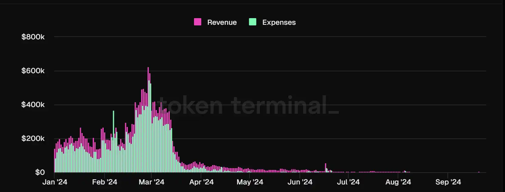 作为 ZK 技术的太子,Starknet 一直备受追捧,但是其基本面表现差强人意。自步入 2024 年以来,Starknet 的收入和其币价一样只有下跌没有反弹。其中,2024Q2 的下滑程度最为严重,与 Q1 937 万美元相比仅有 14.79 万美元的交易费用产生。