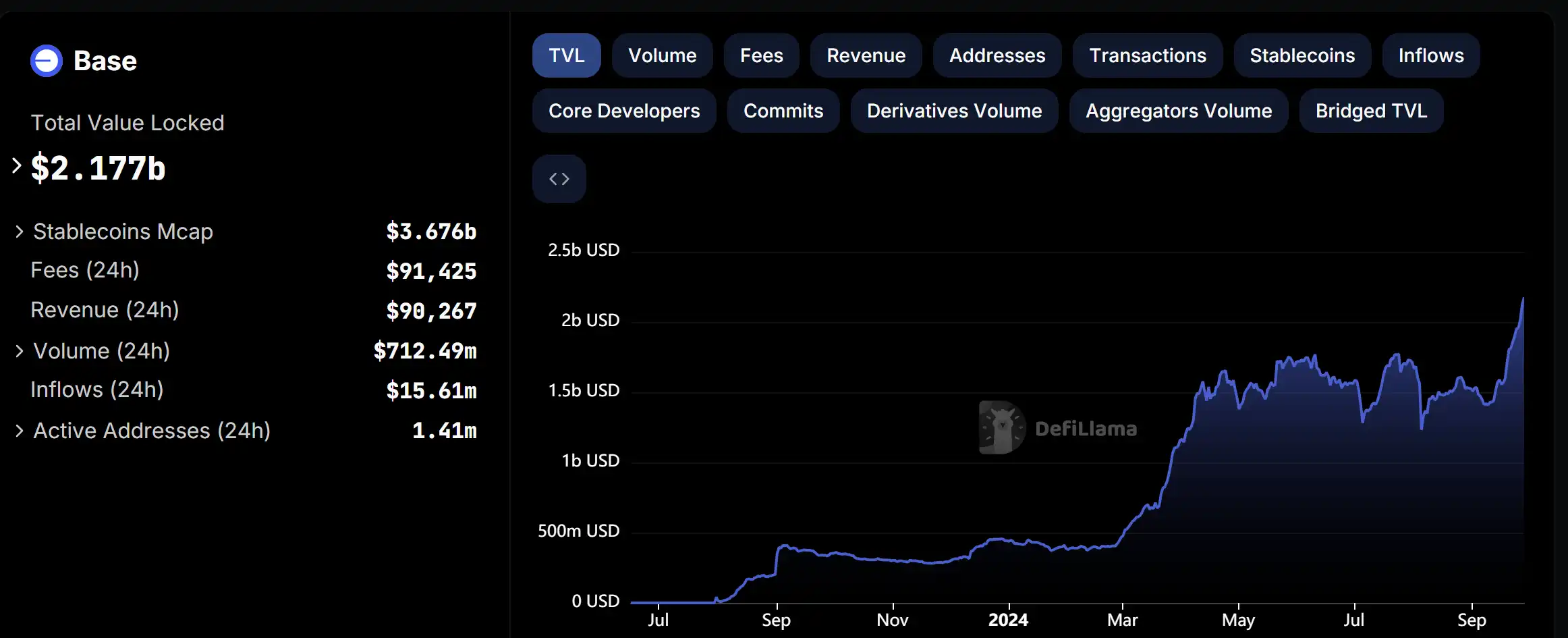 Base TVL 增长情况,数据来源:DeFiLlama