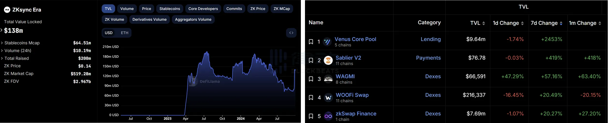 左图:zkSync TVL 增长情况;右图:zkSync TVL 占比分布,数据来源:DefiLlama