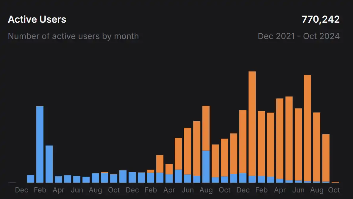 从用户角度来看,Starknet 逐渐沦为「鬼城」。24 年 1 月,Starknet 突破了 120 万月活用户的瓶颈,随后在达到了巅峰时的 220 万。此后开始活跃用户批量流失,用户泡沫最终被刺破。现如今月活用户稳定在 13 万左右。无论是在一级还是二级,推特还是群聊,Starknet 的身影渐渐淡去。