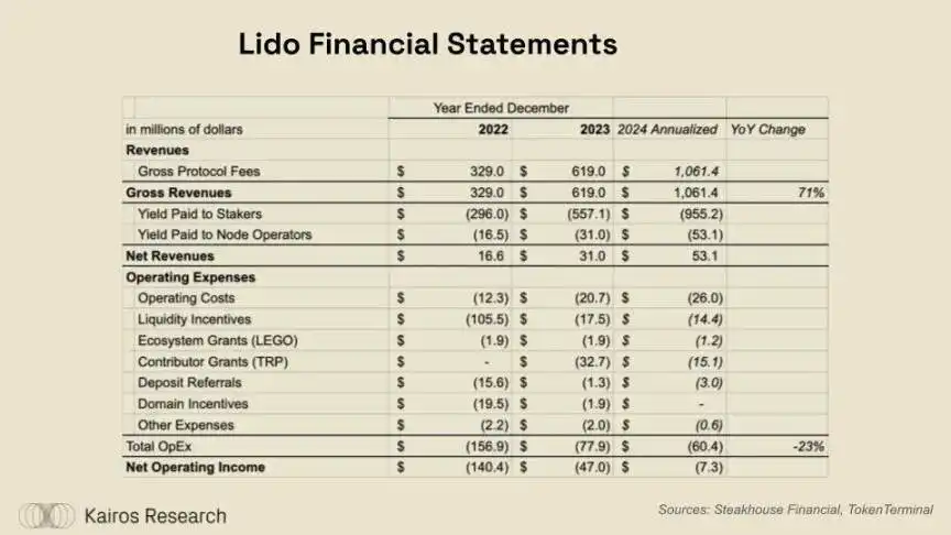 仅在过去两年,Lido 就在削减成本方面取得了巨大进步。流动性激励在引导 stETH 方面非常重要,高级用户自然会倾向于 LST,因为它在整个生态系统中流动性最好的。我们相信,随着 stETH 拥有令人印象深刻的护城河,Lido DAO 将能够进一步减少流动性激励。即使削减成本, 700 万美元的盈利可能也不足以证明 LDO 10 亿美元以上的 FDV 是合理的。