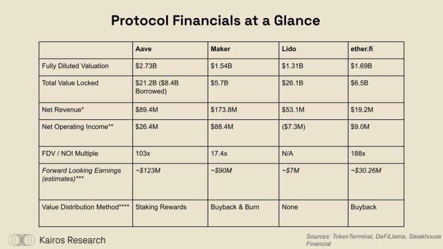 本报告旨在从财务角度探索一些最具影响力的 DeFi 协议,包括每个协议的简要技术概述以及对其收入、支出和代币经济学的深入研究。鉴于无法获得定期审计的财务报表,我们使用链上数据、开源报告、治理论坛和与项目团队的对话来估算 Aave、Maker (Sky)、Lido 和 ether.fi。下表展示了我们在整个研究过程中得出的一些重要结论,让读者可以全面了解每个协议的当前状况。虽然市盈率是判断项目高估和低估的常用方法,但稀释、新产品线和未来盈利潜力等关键因素可以更全面地说明问题。