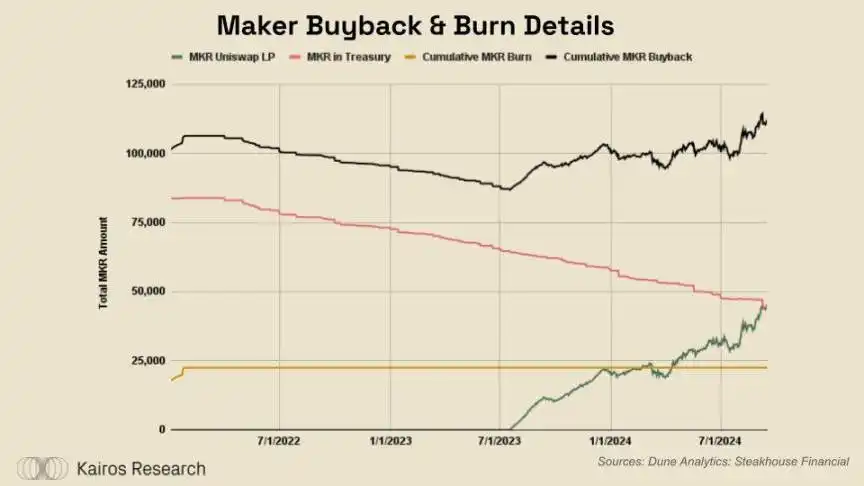 在整个 2024 年,Maker 有望产生约 8840 万美元的净协议收入。MKR 的估值为 16 亿美元,仅为净收入的 18 倍。2023 年,DAO 投票决定修改协议的代币经济学,将部分收益返还给 MKR 持有者。随着 DAI 持续将借款利率(稳定费)累积到协议中,Maker 积累了系统盈余,他们的目标是将其保持在 5000 万美元左右。Maker 引入智能销毁引擎,利用盈余资金在市场回购 MKR。根据 Maker Burn, 11% 的 MKR 供应量已被回购并用于销毁、协议自有流动性或金库建设。