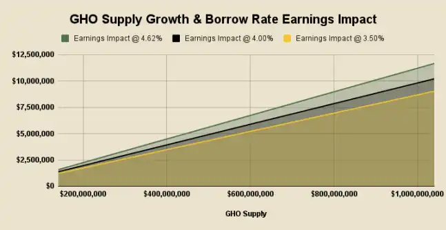 目前,GHO 供应量为 1.42 亿,GHO 的加权平均借入利率为 4.62% ,加权平均 stkGHO 激励支出为 4.52% ,其中 77.38% 的总 GHO 供应量质押在安全模块中。因此,Aave 在价值 1.1 亿美元的 GHO 上赚取 10 个基点,在未质押的 3200 万美元上赚取 4.62% 。考虑到全球利率趋势和 stkAAVE 折扣,GHO 借入利率当然有降至 4.62% 以下的空间,因此我们还增加了对 GHO 影响的预测,分别为 4% 和 3.5% 。未来几年,Aave 应该有很多机会促进 GHO 的增长,下图预测了未偿还 GHO 贷款达到 10 亿美元的路径将如何影响协议收益。