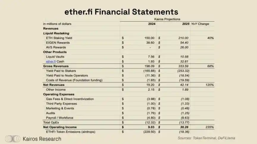 · EIGEN 上市前 FDV 约为 55 亿美元,重新质押奖励的发放计划为 2024 年 1.66% 和 2025 年 2.34% ,这意味着 ether.fi 从 EIGEN 获得的直接收入为: 2024 年约 3860 万美元和 2025 年约 5440 万美元