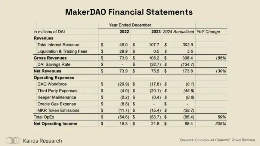 MakerDAO 在过去几年中蓬勃发展,这得益于 2021 年投机性波动期间的清算。但随着全球利率上升,MakerDAO 也创造了更可持续、风险更低的业务线,引入新的抵押资产,例如美国国债使 Maker 能够提高资产效率,并产生高于标准 DAI 借贷利率的回报。在探索 DAO 的支出时,我们清楚地了解以下几点: