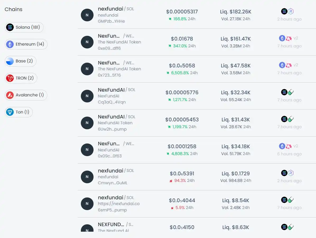 不过, 在过去几个小时内, 已经有大量名称类似于 NexFundAI 的 meme 代币被创造出来并进行活跃交易。