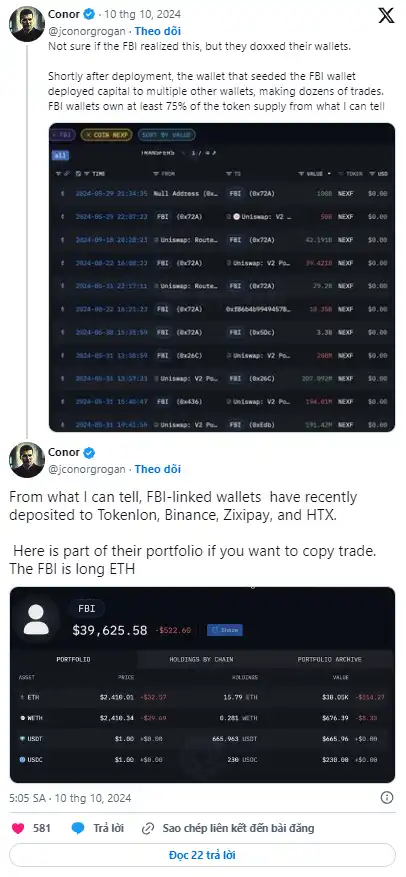 区块链分析师 @jconorgrogan 还发现了 FBI 的加密钱包。