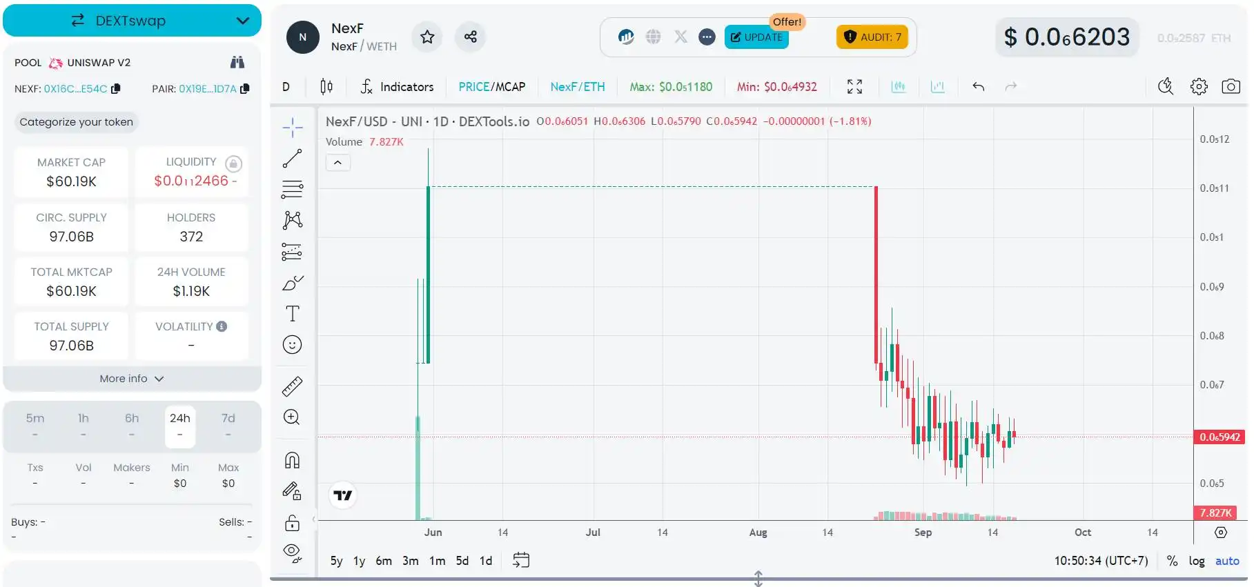 NexFundAI 代币价格图表, 截图自 2024 年 10 月 10 日上午 10:55 的 DEXTools
