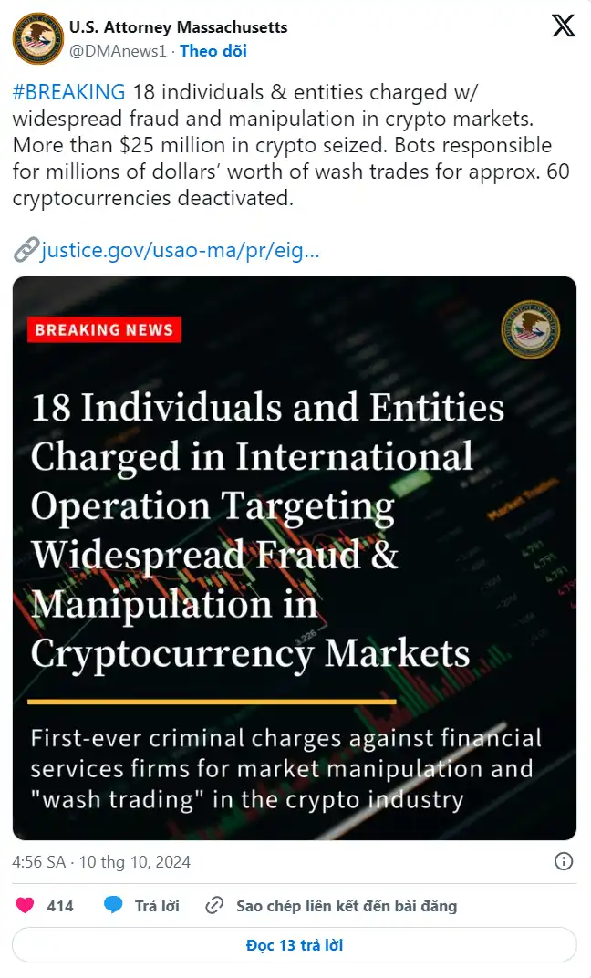 美国司法部于 10 月 9 日起诉了 4 家加密货币公司 Gotbit、ZM Quant、CLS Global 和 MyTrade, 以及这些公司 18 名高管, 指控他们操纵市场和炒作加密货币代币。