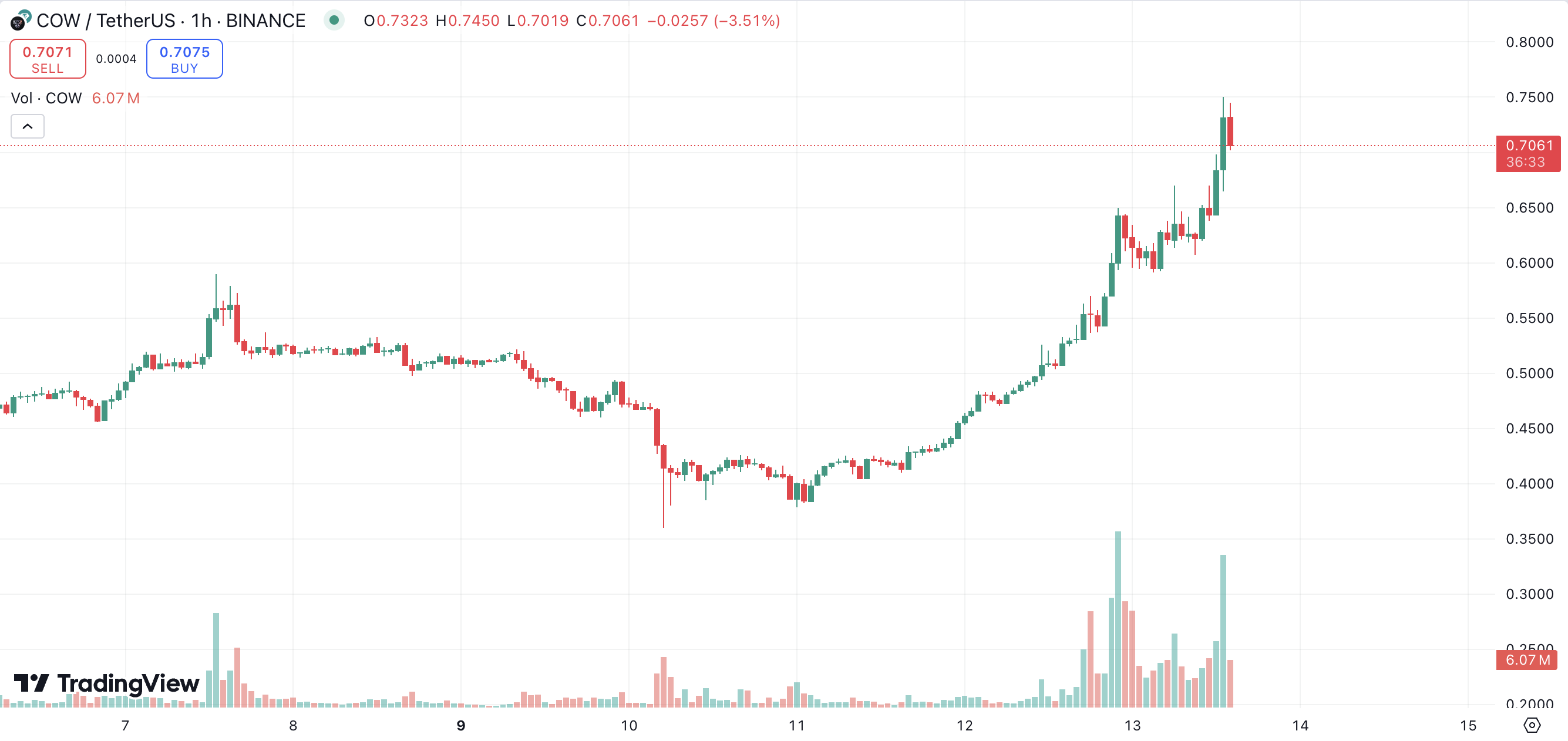 有人说 COW 选择上线 Binance 的日子好才能收获这么高涨幅,还有人说,COW 是 V 神最爱的 swap,每次砸盘 meme 都用 cowswap,所以奶牛本身本身也是 meme,但事实真的如此吗?