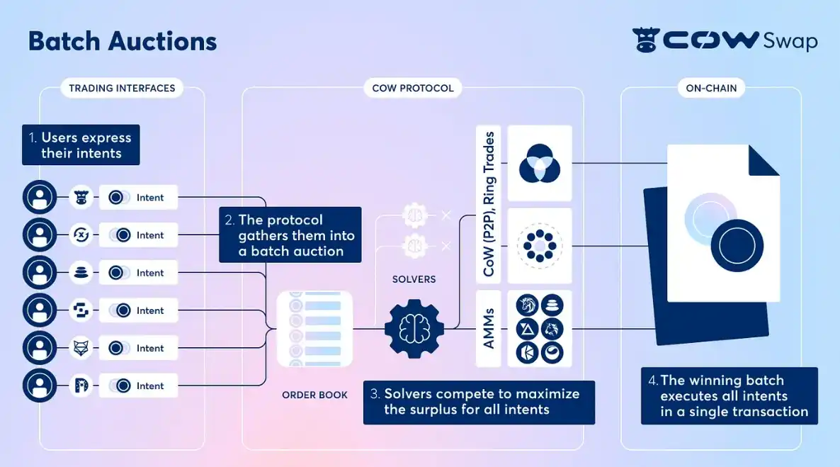 CoW Protocol 引入了一种革命性的交易方式——意图交易。用户无需直接发送交易,而是提交一个经过签名的订单,也就是所谓的交易意图。这个订单精确地定义了用户在特定时间范围内希望交易的资产。值得注意的是,用户无需关心交易的具体执行细节,如滑点或流动性池的选择。这些签名订单随后会在链下传递给被称为 Solvers(解算者)的专业参与者。这些求解者会在订单生效期间展开激烈竞争,力求找出最优的执行路径,而胜出的求解者将赢得执行该笔交易的权利。