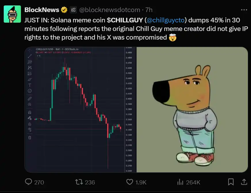 Chill Guy 代币的今早六点交易量突然增多,创作 Chill Guy 形象艺术家 Phillip Banks 发文表示 X 账户遭遇黑客攻击,目前自己仍然无法正常访问账号,激进言论推文并非自己所发,此前「加密仇恨言论」的相关推文发布后,CHILLGUY 短时暴跌 15%,随后快速拉回,现在市值为 3 亿美元左右。目前社区成员都在猜测本次事件是一次有预谋「洗盘」操作。
