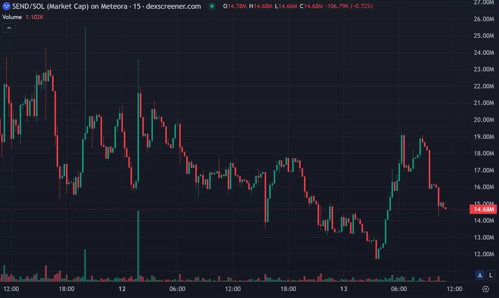 Send 代币在 12 号中午在同时间拉伸到市值最高点 3900 万美元后马上回调到 1500 万美元附近进行震荡。