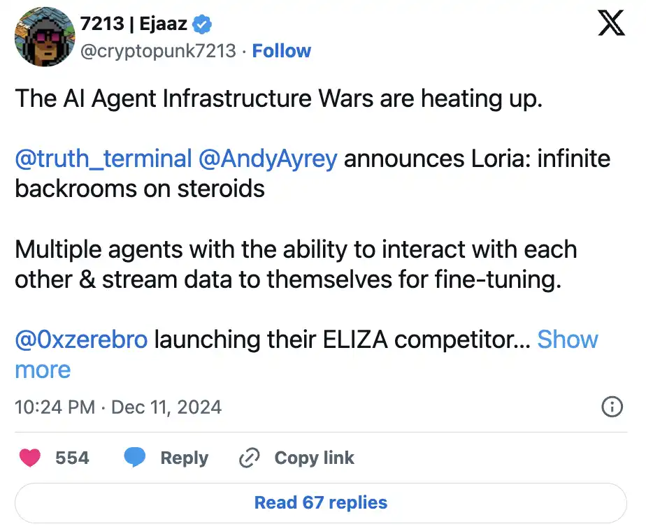 我们对此持相同观点:智能体群体将在 2025 年推动 Web3 AI 智能体的下一波创新、产品和关注。明年,我们预计 ELIZA 智能体将崭露头角,参与大规模的合作活动,重新定义它们在去中心化领域中的角色。